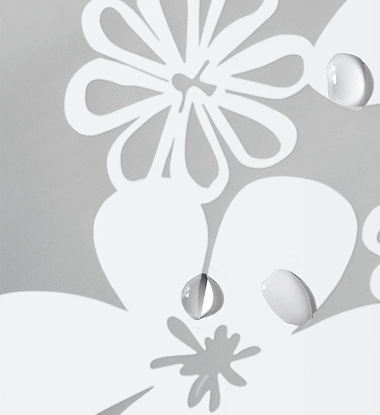 Ominaisuudet: Puoliläpinäkyvä suihkuverho valkoisella kukkakuviolla
