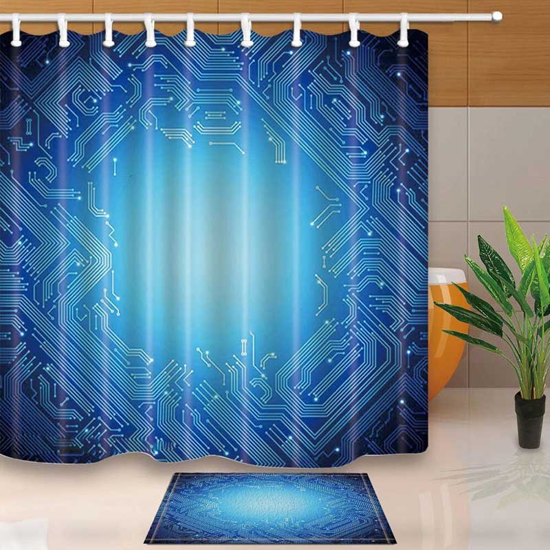 Sininen piirilevy-kuvioinen suihkuverho – Tuo teknologian tunnelma kylpyhuoneeseesi